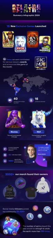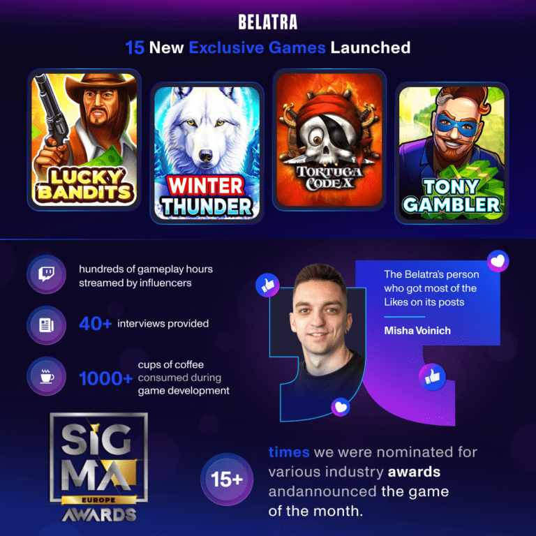 Over the course of the year, 15 exclusive games were launched, captivating players worldwide. Titles including Wolf Thunder, Lucky Bandits, Winter Thunder, Tortuga Codex, and Tony Gambler quickly became player favourites, showcasing Belatra’s prowess in creating bespoke and absorbing titles.