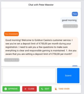On the other hand, if a 40-year-old player decides to set a deposit limit of €360 per month, the fully automated assistant can manage the interaction. If the player’s responses are clear and meet the necessary criteria, there would be no need for further approval by a human responsible gaming staff member. This approach balances efficiency with the need for human intervention, based on the level of risk associated with the player’s request, ensuring that both high-risk and low-risk scenarios are handled appropriately.